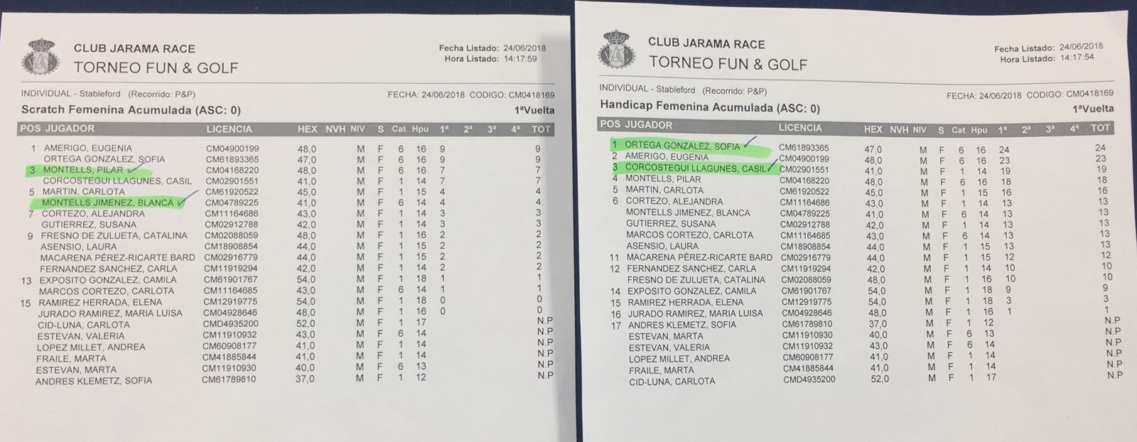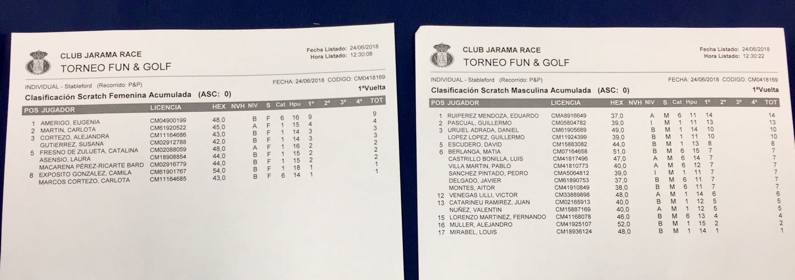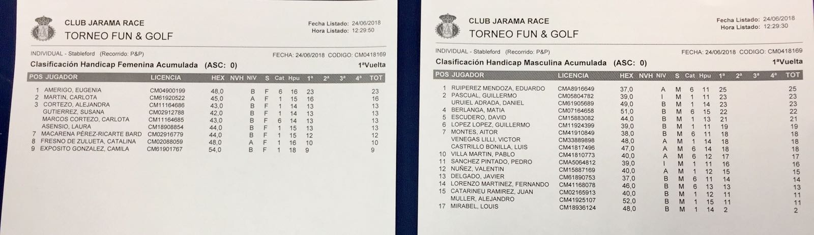 En el primer tiro de las 9:00 en la clasificación masculina el ganador scratch ha sido Eduardo Ruipérez con 14 puntos. El primer clasificado hándicap ha sido Guillermo Pascual con 23 puntos y el segundo clasificado con mismos 23 puntos Daniel Uruiel. En cuanto a la clasificación femenina, la ganadora scratch ha sido Eugenia Amérigo con 9 puntos y la primera clasificada hándicap Carlota Martín con 16 puntos y la segunda clasificada con 13 puntos Alejandra Cortezo.