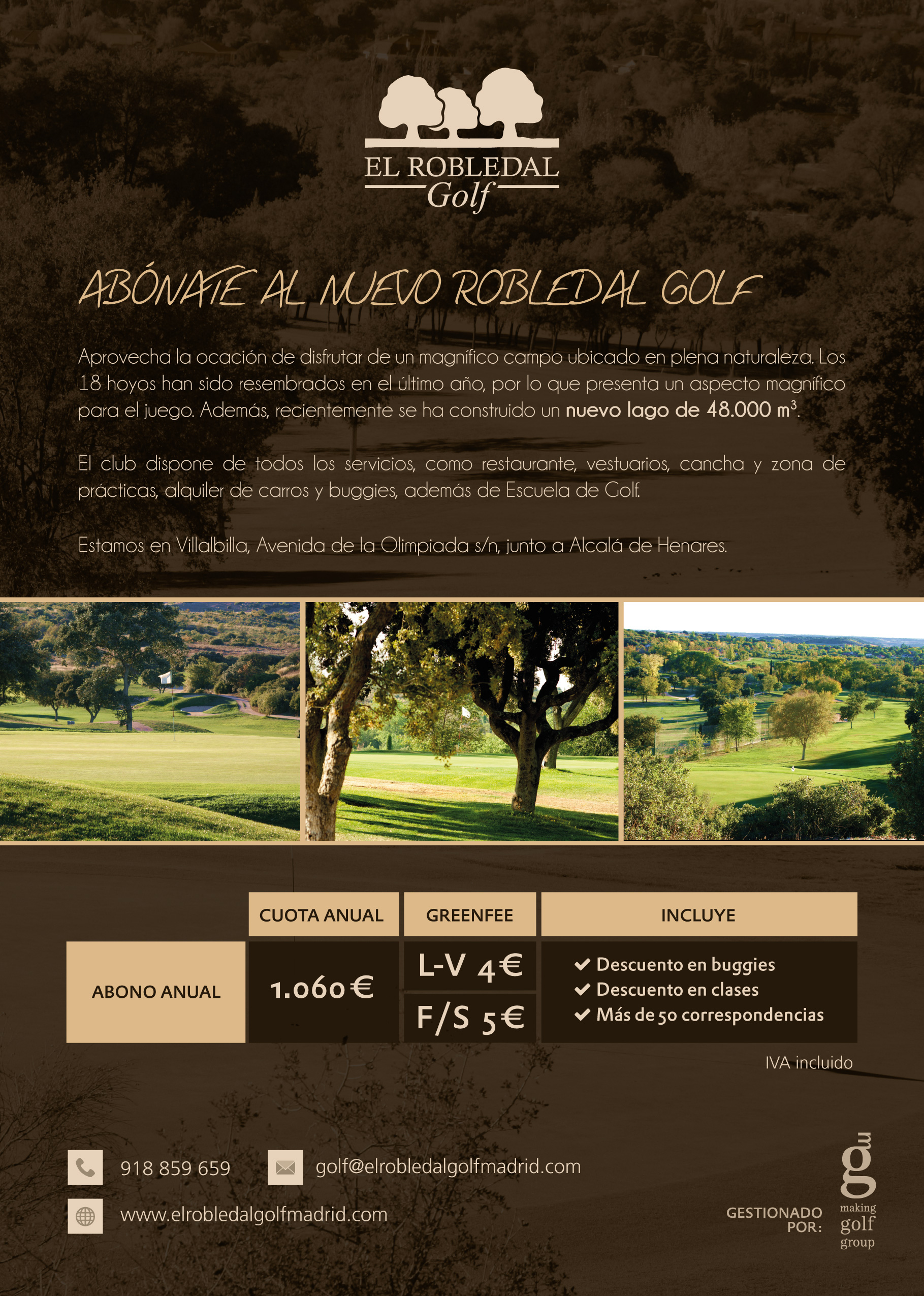 El Robledal Golf ofrece un nuevo abono a un precio de 1.060 € anuales y con greenfees de 4 o 5 €, con descuento en buggies y carros eléctricos. Además, se podrá hacer uso de las diferentes correspondencias del club.