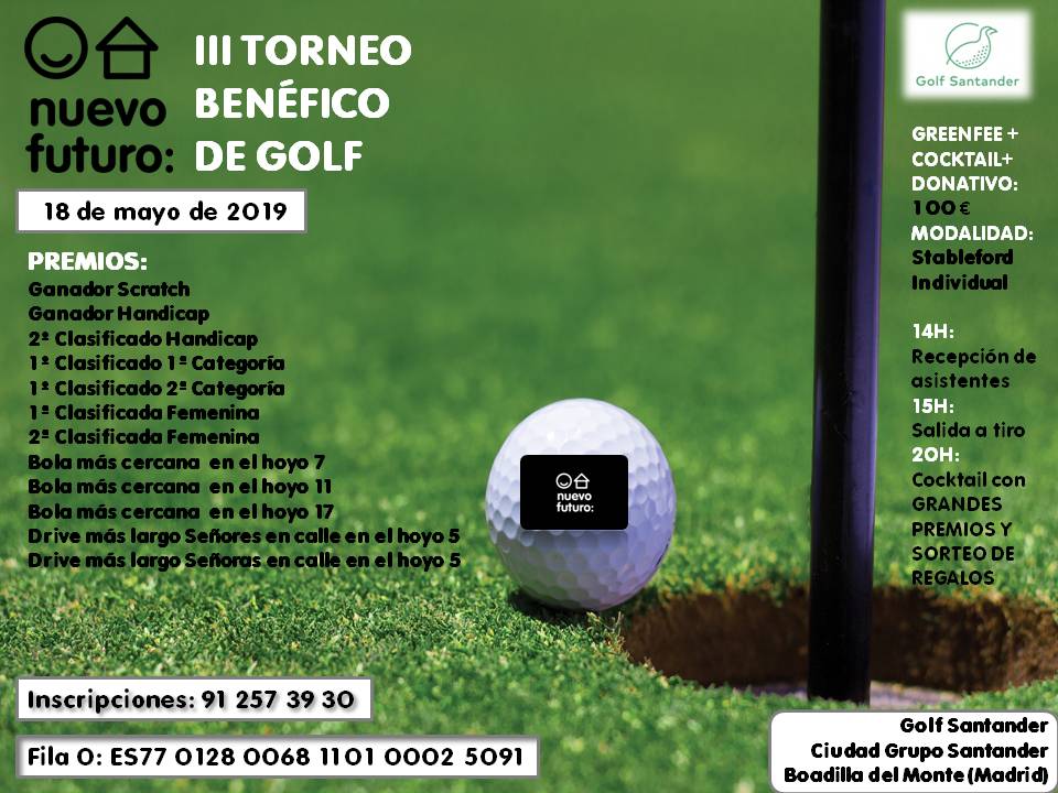 Nuevo Futuro, organización dedicada desde hace 50 años a la protección de menores en riesgo de exclusión social, celebra el próximo 18 de mayo su III Torneo Benéfico de golf.