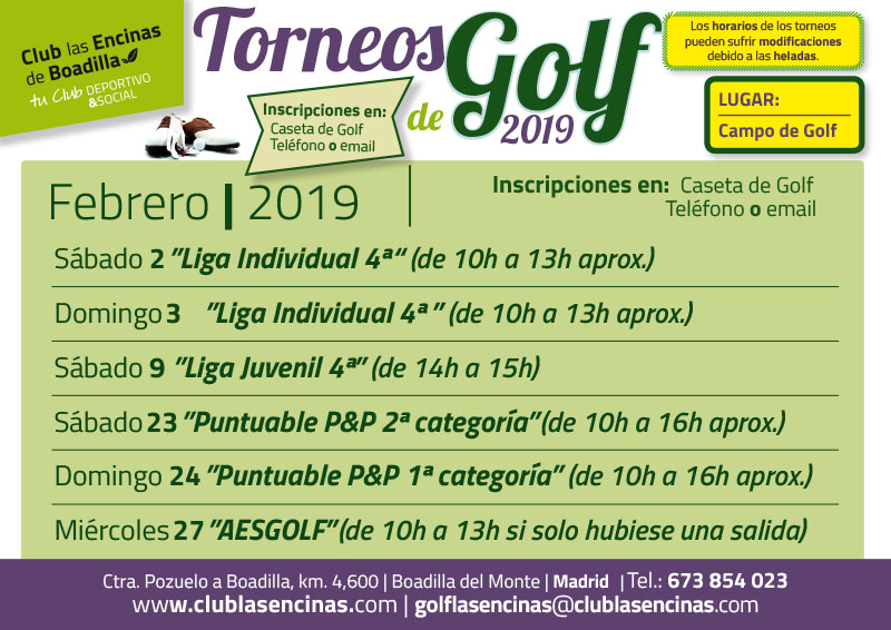 Ven a Las Encinas de Boadilla en febrero y disfruta a lo grande del golf. El club de Las Encinas de Boadilla, situado a 10 km de Madrid, está considerado uno de los más difíciles pares 3 de España. Considerado como uno de los grandes clubes sociales y deportivos más completos de nuestra comunidad, con un carácter social y familiar, que los hace diferentes.