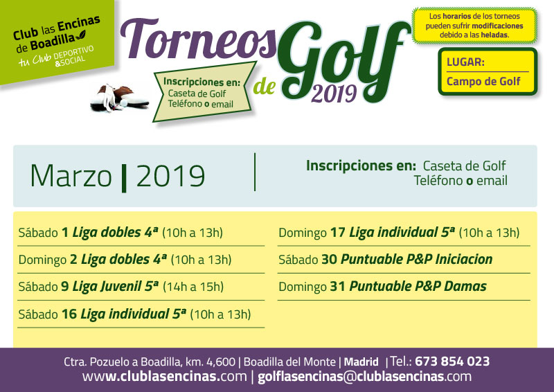 Información e inscripciones en la caseta de golf, por teléfono o mail: