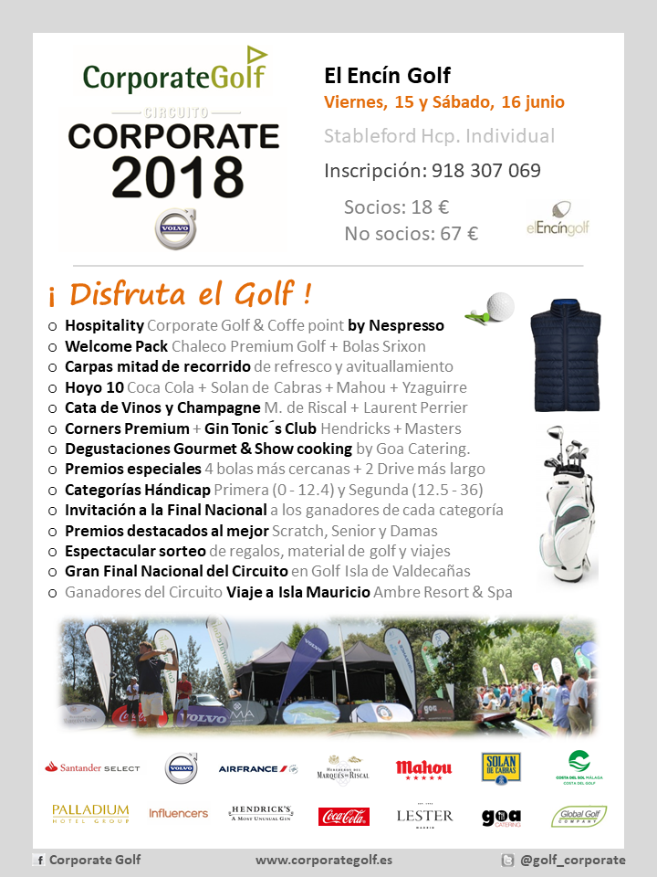 Ven a jugar al Encín Golf el próximo viernes 15 y sábado 16 de junio. El magnífico recorrido de El Encín acoge el viernes 15 y sábado 16 de junio en X Aniversario del Circuito Corporate Golf.